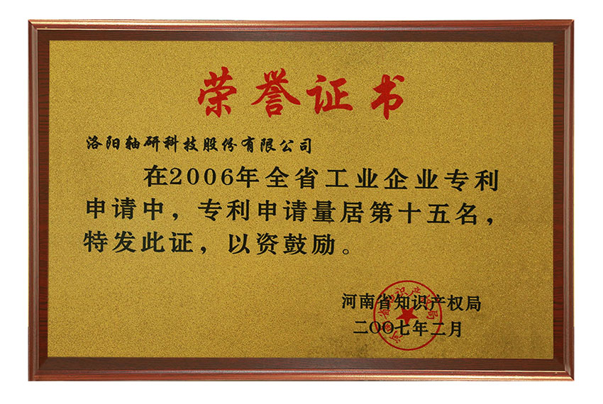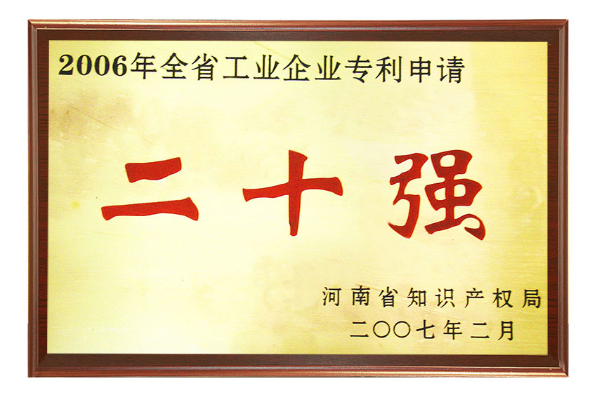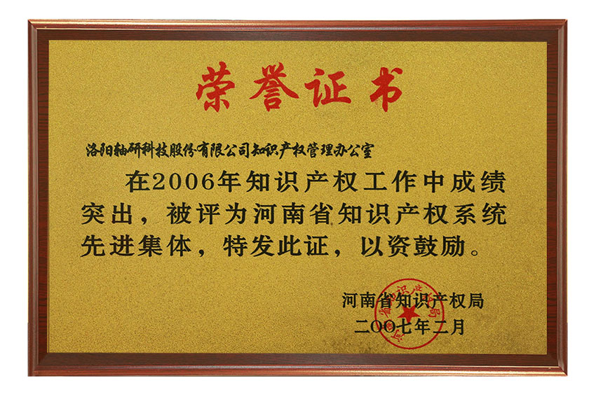 在2006年知识产权工作中成绩突出,被评为河南省知识产权系统先进集体