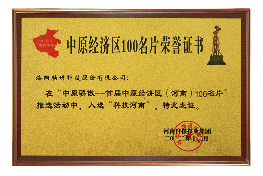 中原经济区100名片证书